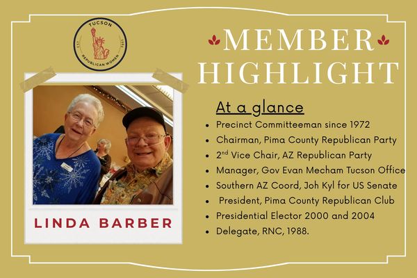 Many of you know of Ms Linda Barber, but do you know Ms Linda? She has been in Republican politics for a whole lot of years. She’s been a precinct committeeman since 1972!! How amazing is that? From being a legislative district chairman, president of several entities, chairman of the county party, a vice chair of the state party and an office manager for the AZ Governor, she has also had the prestige of being a National Delegate and a Presidential Elector! Ms Linda has seen the good, the bad and the ugly of Pima County for sure. Her most interesting job, however, wasn’t in politics. She worked at Disneyland for three summers during college. Ms Linda has such a vast number of memories of people she has met and worked with over the years. She values the Tucson Republican Women’s Club for the friendships and the club’s eagerness to learn.